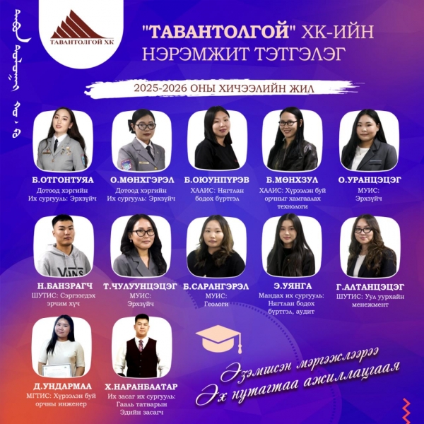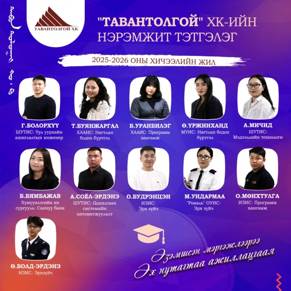 "Тавантолгой" ХК-ийн нийгмийн хариуцлагын хүрээнд, Орон нутгийн боловсролыг дэмжих, Өмнөговь аймгийн оюутан залуусын сурч хөгжих боломжийг олгож залуучуудаа “Эзэмшсэн мэргэжлээрээ Эх нутагтаа ажиллацгаая" уриан дор орон нутгийнхаа тогтвортой хөгжилд хувь нэмрээ оруулах үүднээс уламжлал болгон заралдаг тэтгэлэгт хөтөлбөрт 2025-2026 оны хичээлийн жилд шалгарсан оюутан залуучууддаа батламж гардууллаа. Батламжийг “Тавантолгой” ХК-ийн гүйцэтгэх захирал Ш.Отгонбаяр гардуулж оюутан залуусдаа амжилт хүслээ.