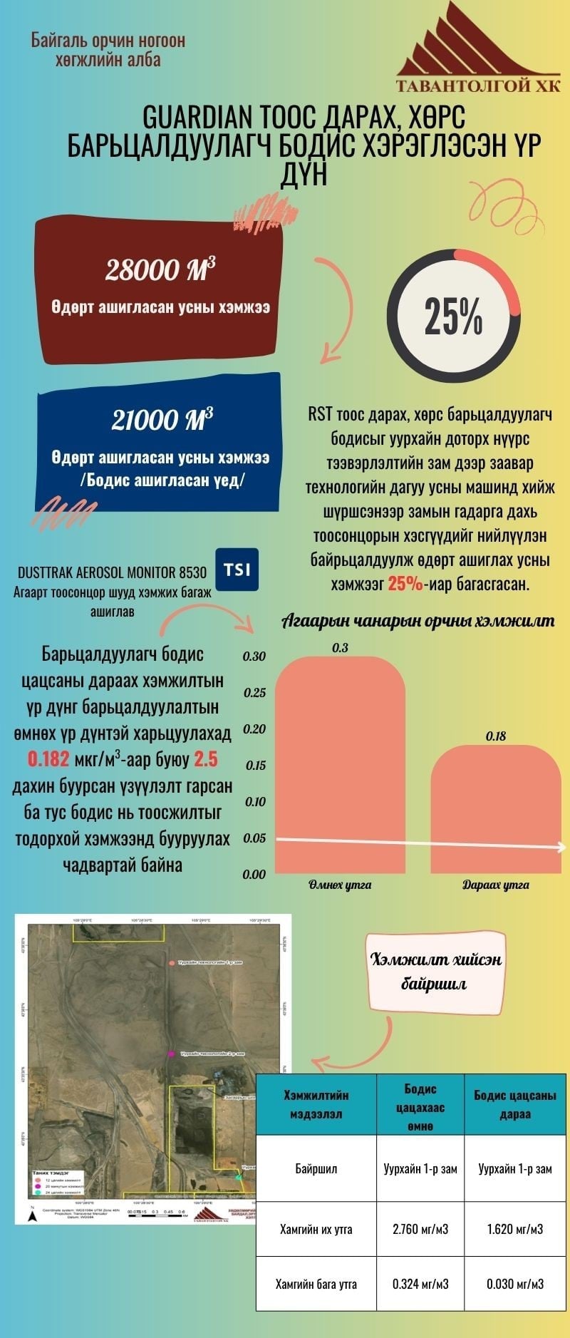 30 хоногийн бодистой усалгаа хийсэн үр дүнгээс харахад Усны хэрэглээ 25%-аар буюу 7,000 м3 багассан, тоосны хэмжээ 0.182 мкг/м3-аар буюу 2.5 дахин буурсан үзүүлэлттэй байна.