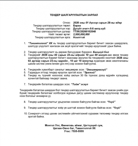 ТЕНДЕР ШАЛГАРУУЛАЛТЫН ЗАРЛАЛ
